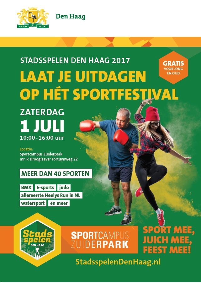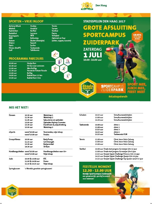 De afgelopen periode zijn er in diverse stadsdelen in Den Haag activiteiten georganiseerd in het teken van de stadsspelen 2017. Zaterdag 1 juli wordt het evenement afgesloten met een groot sportief feest in en rondom de recent geopende Sportcampus Zuiderpark. Er is een bomvol programma voor jong en oud, sportief of juist niet! Iedereen kan gratis meedoen met leuke (sportieve) activiteiten. zowel binnen als buiten.