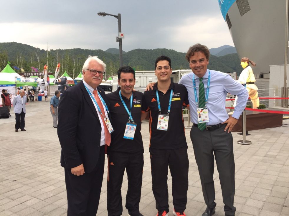 Delegatie Muju 2017: Bondsvoorzitter Fred Buitenhuis, coaches Karim Dighou en Manni Zareei en Nederlands IOC-lid de heer Camiel Eurlings.