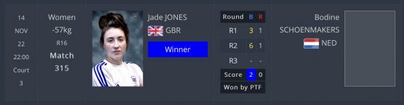 Op de tweede dag van de WK startte Bodine Schoenmakers in de gewichtsklasse -57 kg. Bodine bereikte de beste 16 na winst tegen Tekiath Ben Yessouf uit Niger. In de strijd om de kwartfinale moest Bodine haar meerdere erkennen in de wereldkampioene 2019 en 2-voudig Olympisch kampioene Jade Jones uit Groot Brittannië.