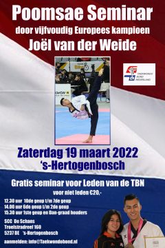 Gratis Poomsae Seminar van vijfvoudig en regerend Europees kampioen “Joel van der Weide” Zaterdag 19 maart verzorgd de Taekwondo Bond Nederland een gratis