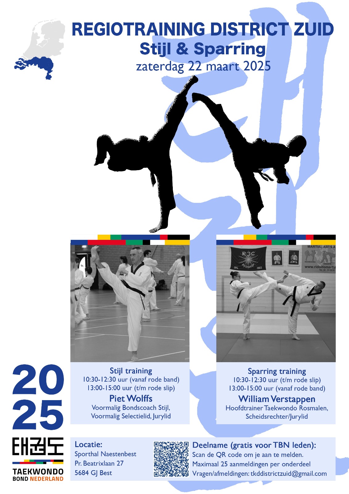 Maart, 2025 Districtstraining stijl en sparring district Zuid 22maralldayDistrictstraining stijl en sparring district ZuidBest Evenementen details Evenementen details InformatieFlyer TijdGehele dag (Zaterdag) KalenderGoogleCal