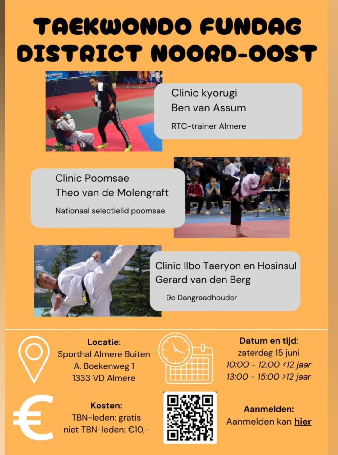 Juni, 2024 Taekwondo Fundag Noord-Oost 15junalldayTaekwondo Fundag Noord-OostAlmere Evenementen details Clubs kunnen hun sporters aanmelden via: aanmeldformulier Fundag 24 juni Meer Evenementen details Clubs kunnen hun sporters aanmelden via: aanmeldformulier Fundag 24 juni InformatieFlyer TijdGehele dag (Zaterdag) KalenderGoogleCal