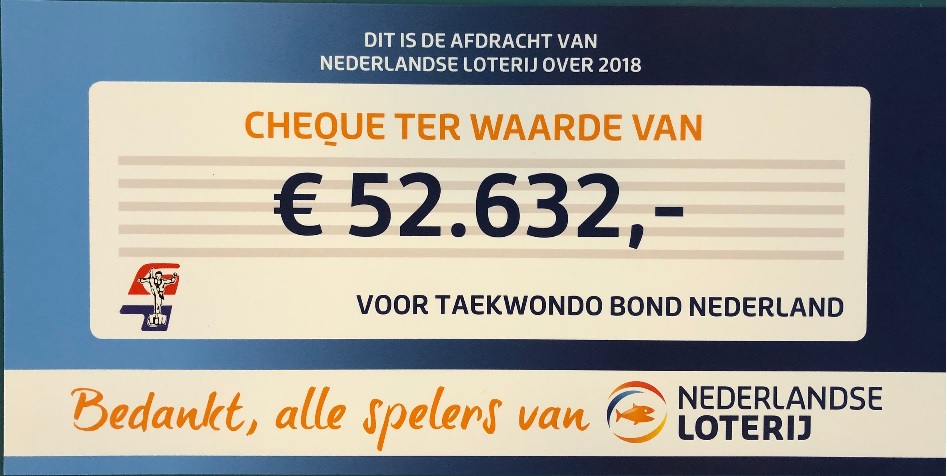 De Taekwondo Bond Nederland heeft over 2018 een bedrag van € 52.632,- ontvangen van Nederlandse Loterij als bijdrage voor de taekwondosport!
