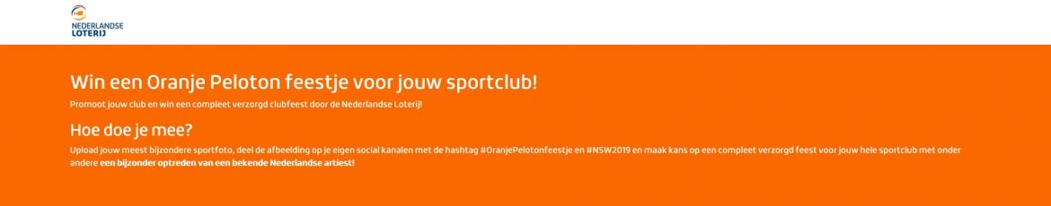 Hoe doe je mee? Upload jouw meest bijzondere sportfoto, deel de afbeelding op je eigen social kanalen met de hashtag #OranjePelotonfeestje en #NSW2019 en maak kans op een compleet verzorgd feest voor jouw hele sportclub met onder andere een bijzonder optreden van een bekende Nederlandse artiest!
