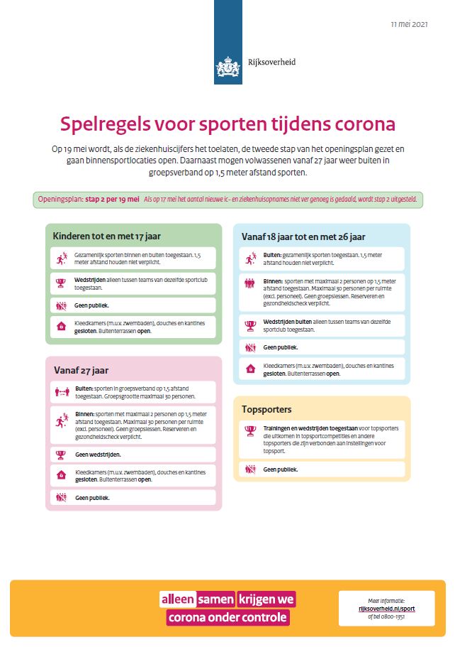 Op 19 mei wordt, als de ziekenhuiscijfers het toelaten, de tweede stap van het openingsplan gezet en gaan binnensportlocaties open. Daarnaast mogen volwassenen vanaf 27 jaar weer buiten in groepsverband op 1,5 meter afstand sporten.