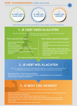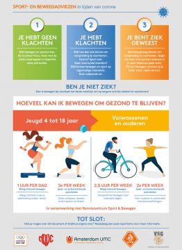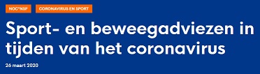 Samen met het Amsterdam Universitair Medisch Centrum, de Koninklijke Nederlandse Voetbalbond, de Vereniging voor Sportgeneeskunde, heeft NOC*NSF een document opgesteld met sport- en beweegadviezen in tijden van het coronavirus. Het doel van dit document is het geven van voorlichting over sporten en bewegen als je