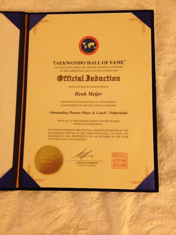 In Las Vegas werd Henk een certificaat overhandigd welke de opname in de Taekwondo Hall of Fame bevestigde.
