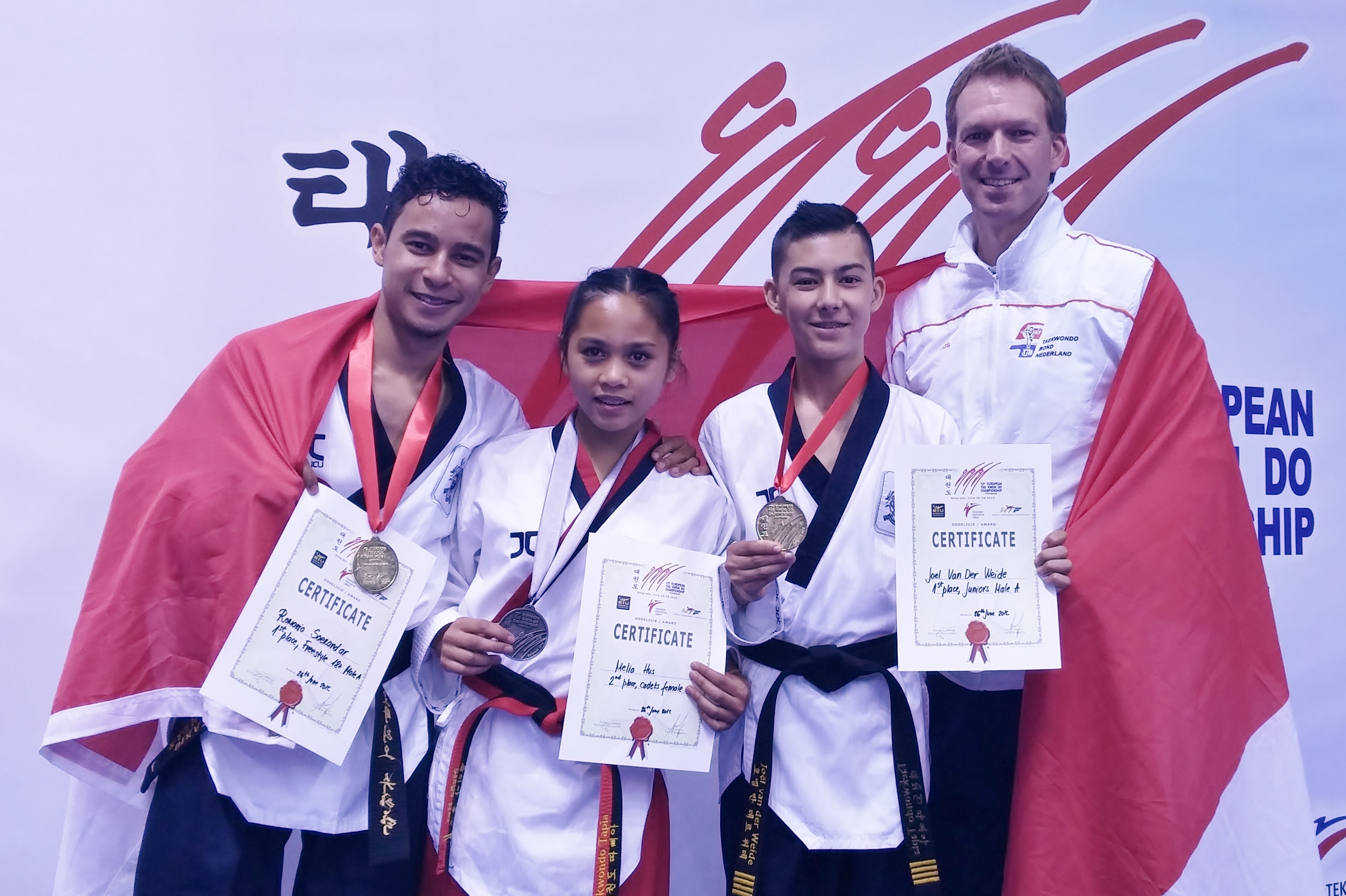 Tijdens de eerste wedstrijddag van het Europees kampioenschap Poomsae heeft de Nederlandse poomsaeselectie goed gescoord. In de juniorenklasse wist Joël van der Weide Europees kampioen te worden. Ook Romario Soekandar bemachtigde de Europese titel in het onderdeel Freestyle. Melia Hus behaalde een mooie zilveren plek in de klasse cadetten. Mooie prestaties op de eerste dag van het EK in Belgrado.